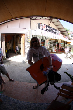 今回彼に渡した板は、P=CAT。細めに板が好みな彼は、少し幅広のこの板を見た時、少し不安になっていましたが、初日の海上がりの彼の表情を見てみたら、ニッコニッコでした。