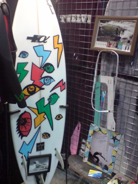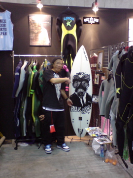 今回も昨年同様に12Snowboards様で弊社とのコラボ作品のサーフボードも展示して頂き、更にはLexor Wet suitsのシンペイさんのご好意でWet Suitsの横に少しだけ弊社のLucasペイントのサーフボードも展示させて頂きました。