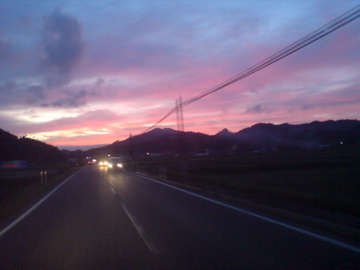 その帰り道、綺麗な紅葉した山道を抜けると、こんなに真っ赤な夕焼けが。