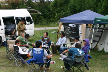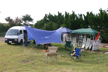 千葉県は東金道路を終点までは知って頂き、九十久里有料道路を海に突き当たるまで、有料を降りたら信号を左折、200Mくらい走ると左手にファミリーマートが見えて来ます、そこを通り過ぎて次の路地を右に行くと、左手に僕らのテントが見えて来ます。