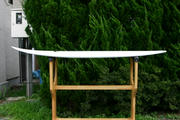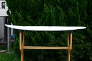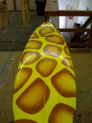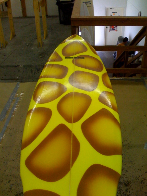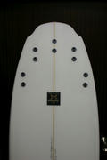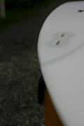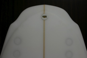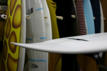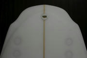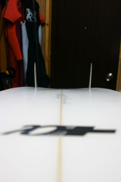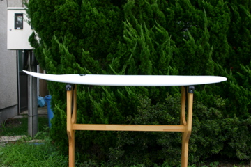 このボードはセンター付近に乗ることが多いため、センター〜テールにかけて厚みを持たせ、ノーズ付近はある程度の薄さにすることで、ノーズの重さを感じなくさせようという新しい試みをしてみました。