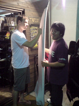吉祥寺のBussel様にもご挨拶に行き、お客様とお食事もご一緒して頂きました。その後お客様のオーダが取れて、もう一人のお客様もサーフボードをお買い上げして頂きました。有り難うございました。お客様にサインしていました。